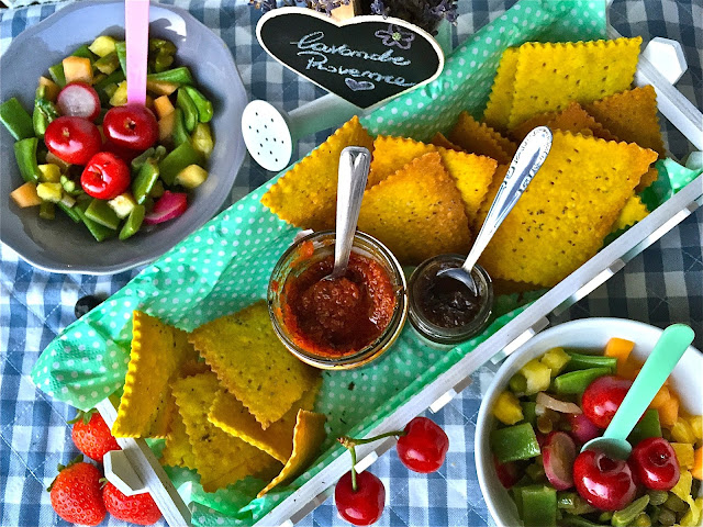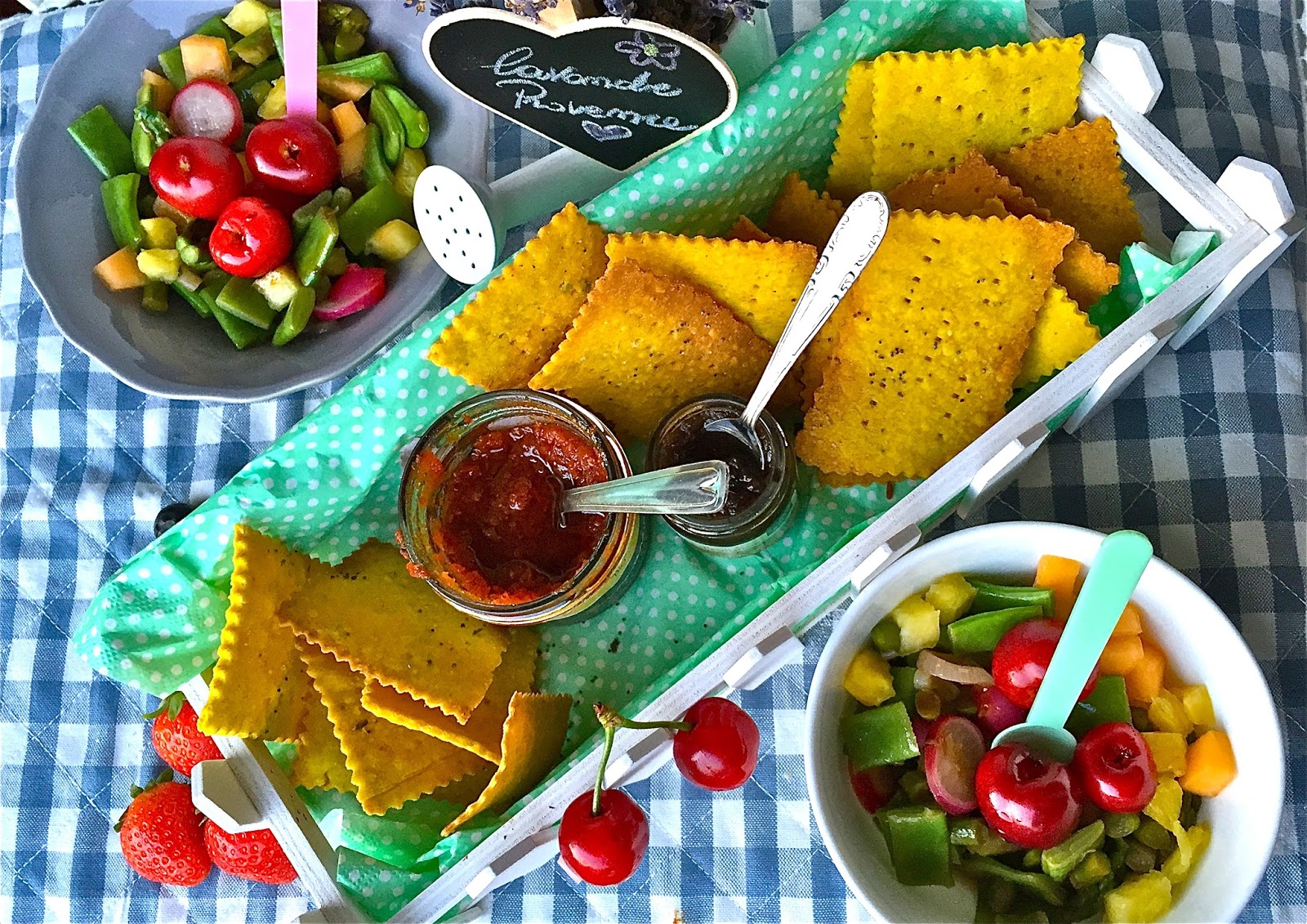 L’estate è alle porte o almeno dovrebbe anche se, viste le condizioni meteo degli ultimi giorni, sembrerebbe di essere più in autunno! Comunque niente scuse, l’estate è alle porte e bisogna rimettersi in forma! O almeno provarci 😉 Per il mio menù ciliegioso come avrete già visto nei post recenti ho ideato l’insalata surrealista che amo tantissimo dal nome al piatto 🙂 Per accompagnarla ho pensato di preparare questi crackers leggeri e gustosi, con farina di mais, farina integrale, farina di riso, curcuma, erba cipollina ed altri aromi a piacere! Io ho aggiunto qualche seme di papavero, ma potete sbizzarrirvi, con semi di lino, girasole, pomodori secchi tritati e chi più ne ha più ne metta! Senza esagerare mi raccomando! 😉 Pronti per la preparazione? E facile facile, veloce veloce, pari quasi alla velocità con cui spariscono questi crackers 🙂 La ricetta è ancora da perfezionare, ma tenendo conto che era il primo esperimento posso comunque dirmi soddisfatta. Le mie amiche tester hanno gradito. Ho servito i crackers accompagnati da due salsine, una di pomodorini ciliegini ottima di Sommariva, storica azienda agricola di Albenga nel savonese in Liguria ed una composta di cipolle comprata in Provenza. Ottime entrambe, ma la prima di gran lunga superiore!