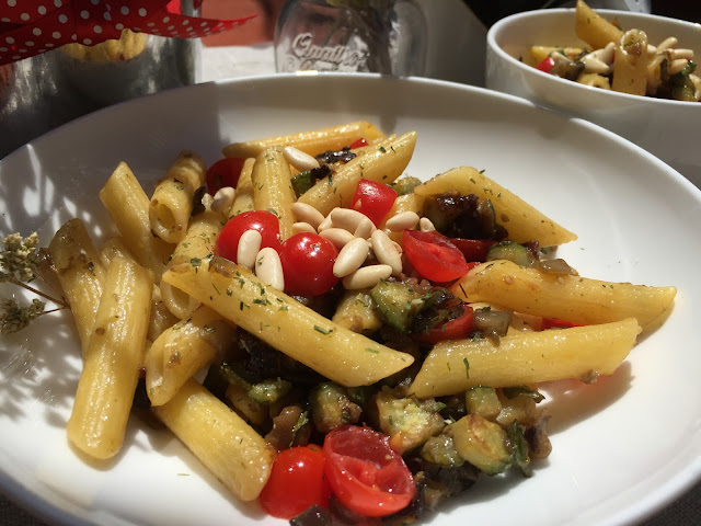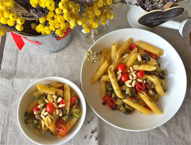 Eccoci siete pronte? 🙂 Allora prima di tutto un’ora prima della preparazione della pasta lavare e tagliare le melanzane a fette rotonde dello spessore di un cm circa, salarle e lasciarle scolare in un piatto. Trascorso il tempo necessario strizzarle e tagliarle a piccoli cubetti. Lavare e tagliare a cubetti anche le zucchine. Farle soffriggere in padella con l’aglio imbiondito nell’olio e cuocere finché non diventano dorate e croccanti, verso la fine aggiungere i pomodorini, lavati tagliati a rondelle e privati dei semini. Salare a piacere. A parte tostare i pinoli. Cuocere la pasta (io uso le mezze penne), scolarla ben al dente, un po’ prima del termine della cottura, poi buttarla in padella insieme al condimento e farla saltare due -tre minuti. Servire guarnendo i piatti con i pinoli tostati ed un po’ di prezzemolo (oppure erba cipollina) tritato. Voilà in poche semplici mosse il vostro piatto di pasta al profumo di casa è pronto! Non è una meraviglia? E che gusto! Da fare assolutamente il bis!