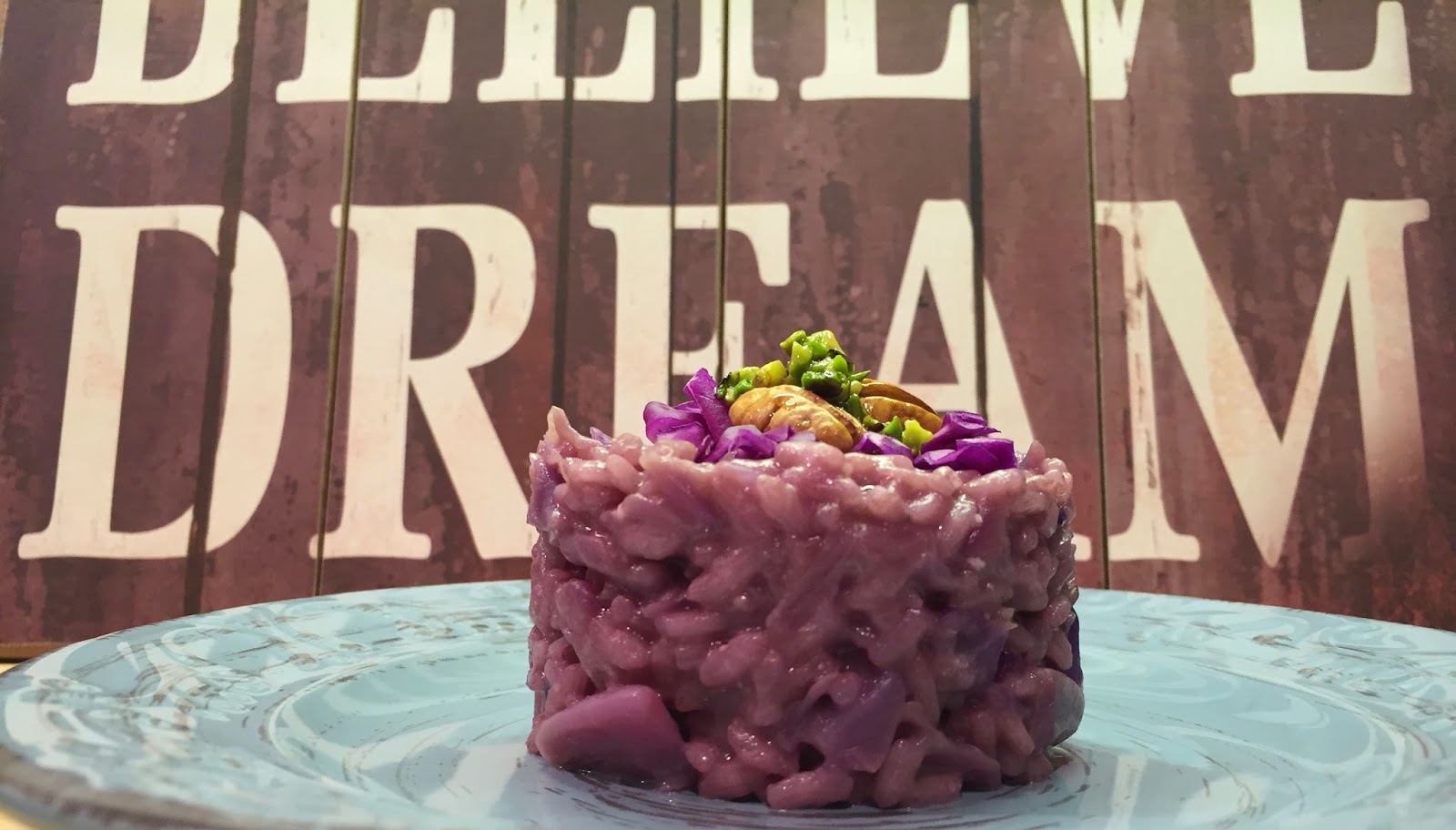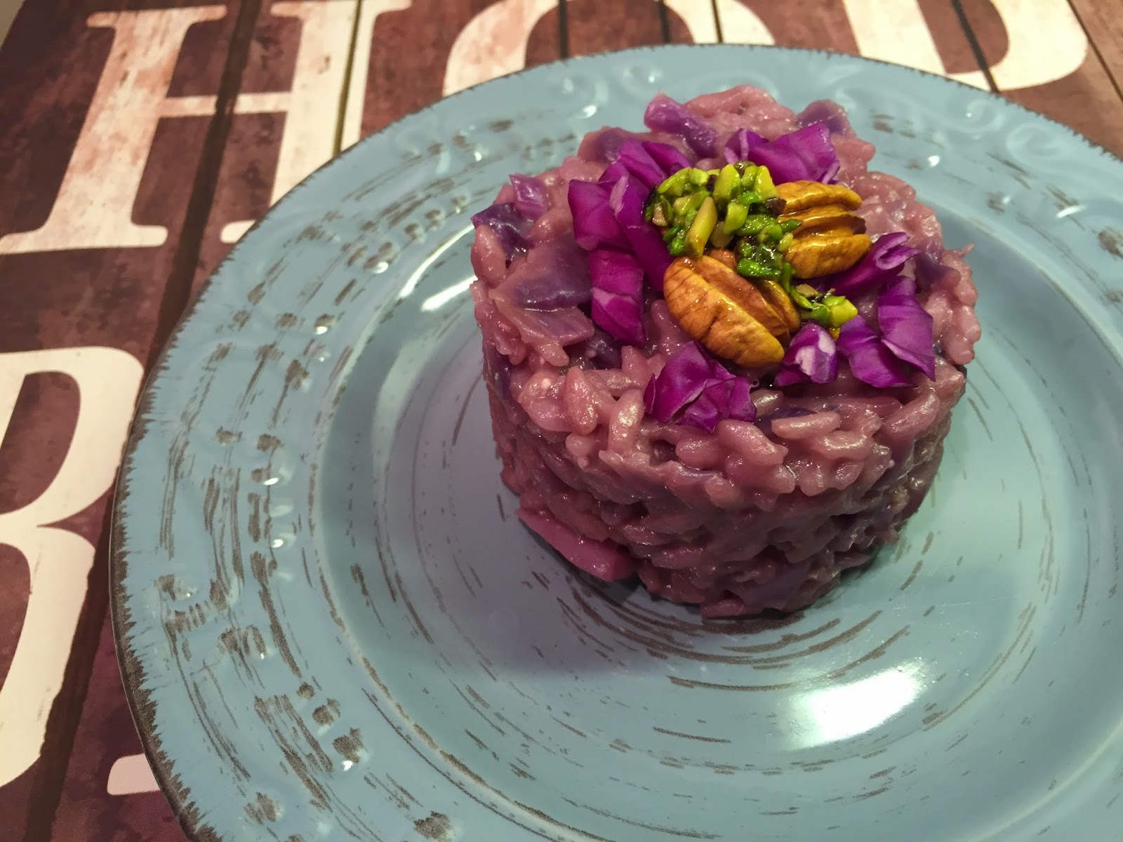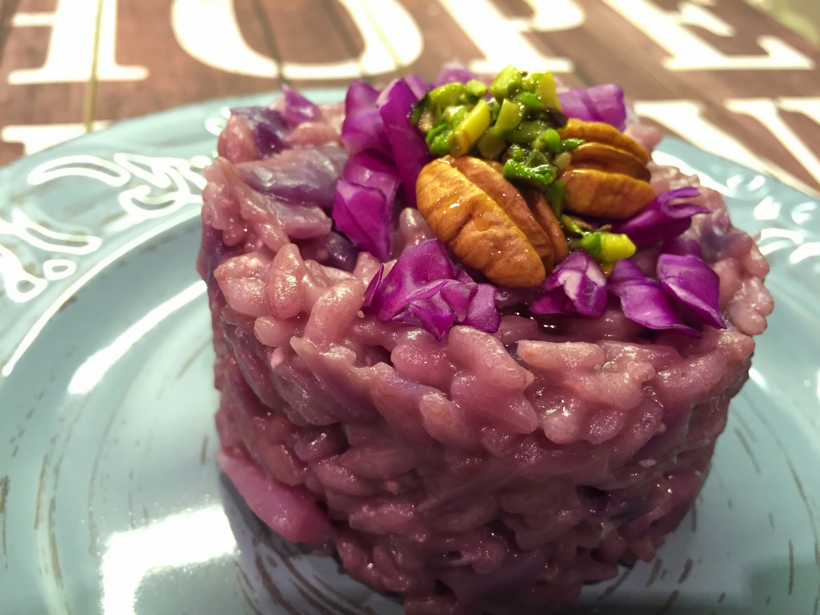 Per la guarnizione caramellate le noci pecan con miele e sciroppo d’agave ed una goccia di balsamico, idem per i pistacchi. Impiattate il riso con l’aiuto di un coppapasta guarnitelo con qualche fogliolina di cavolo, le noci ed i pistacchi caramellati. Buon appetitooooo!!!!